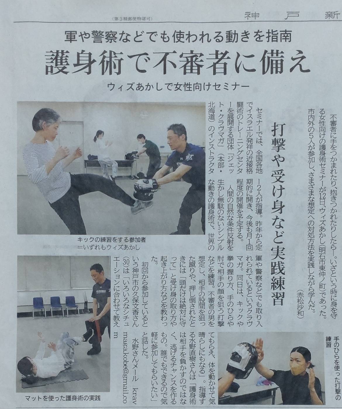 毎月開講されている、明石「女性のための護身術セミナー」が神戸新聞の記事に掲載されました。